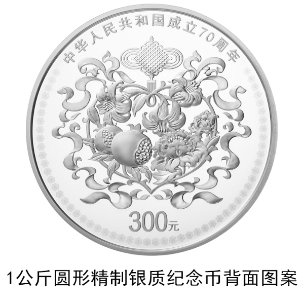 1公斤圓形銀質紀念幣背面圖案為寓意民族團結同心,普天歡頌國慶的組合圖案,并刊“中華人民共和國成立70周年”字樣及面額。