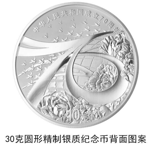 30克圓形銀質紀念幣背面圖案為寓意慶賀祖國華誕,禮贊祖國繁榮的組合圖案,并刊“中華人民共和國成立70周年”字樣及面額。