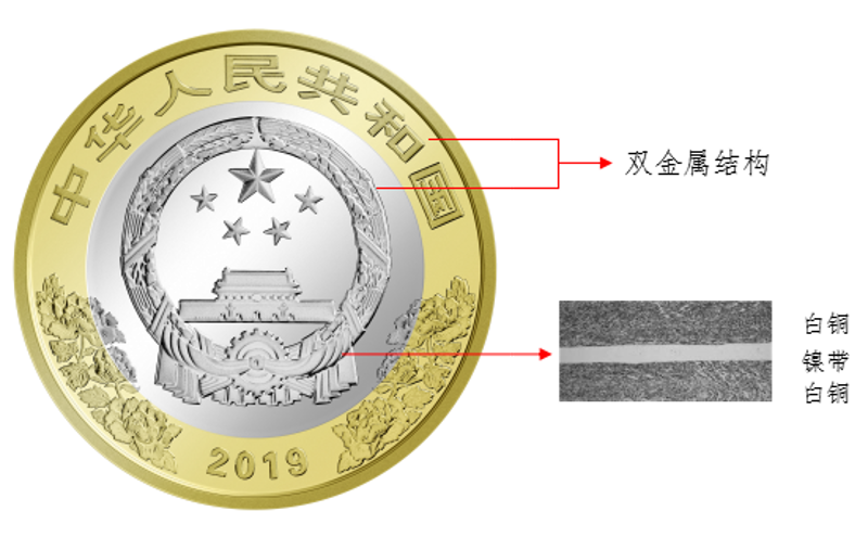 硬幣外環為黃銅合金,內芯為具有獨特機讀性能的鎳帶復合白銅造幣材料。